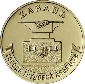 На оборотной стороне монеты «Казань» расположено рельефное изображение фрагмента памятника труженикам тыла. По окружности имеются надписи, вверху: «КАЗАНЬ», внизу, на ленте: «ГОРОДА ТРУДОВОЙ ДОБЛЕСТИ».