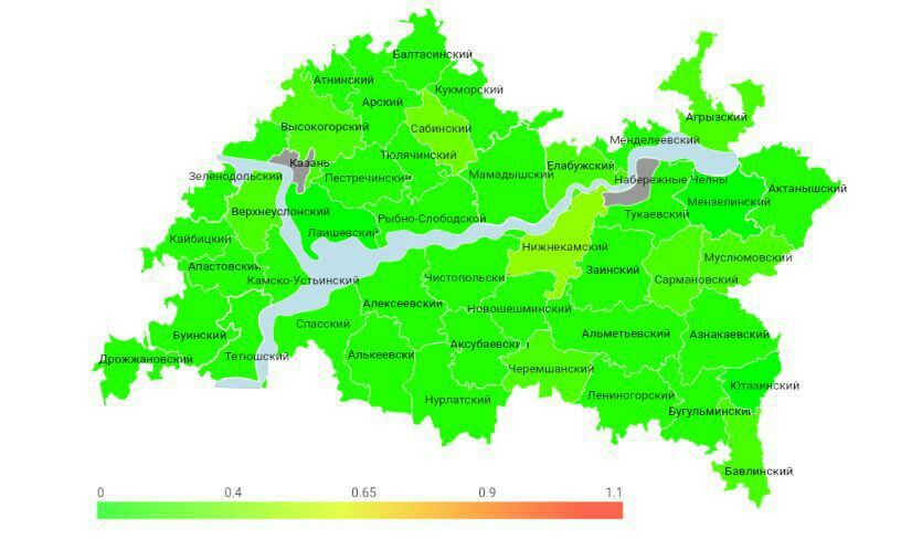 Нижнекамский 0,53% Сабинский 0,41% Агрызский 0,40% Верхнеуслонский 0,40% Казань 0,38% Чермашнский 0,36% Сармановский 0,35% Елабужский 0,34% Бавлинский 0,31% Муслюмовский 0,29%На карте цветовым градиентом показана обстановка в муниципалитетах республики: от зеленого (самый низкий уровень безработицы — ниже 0,4%) до красного (высокий — более 0,9%).