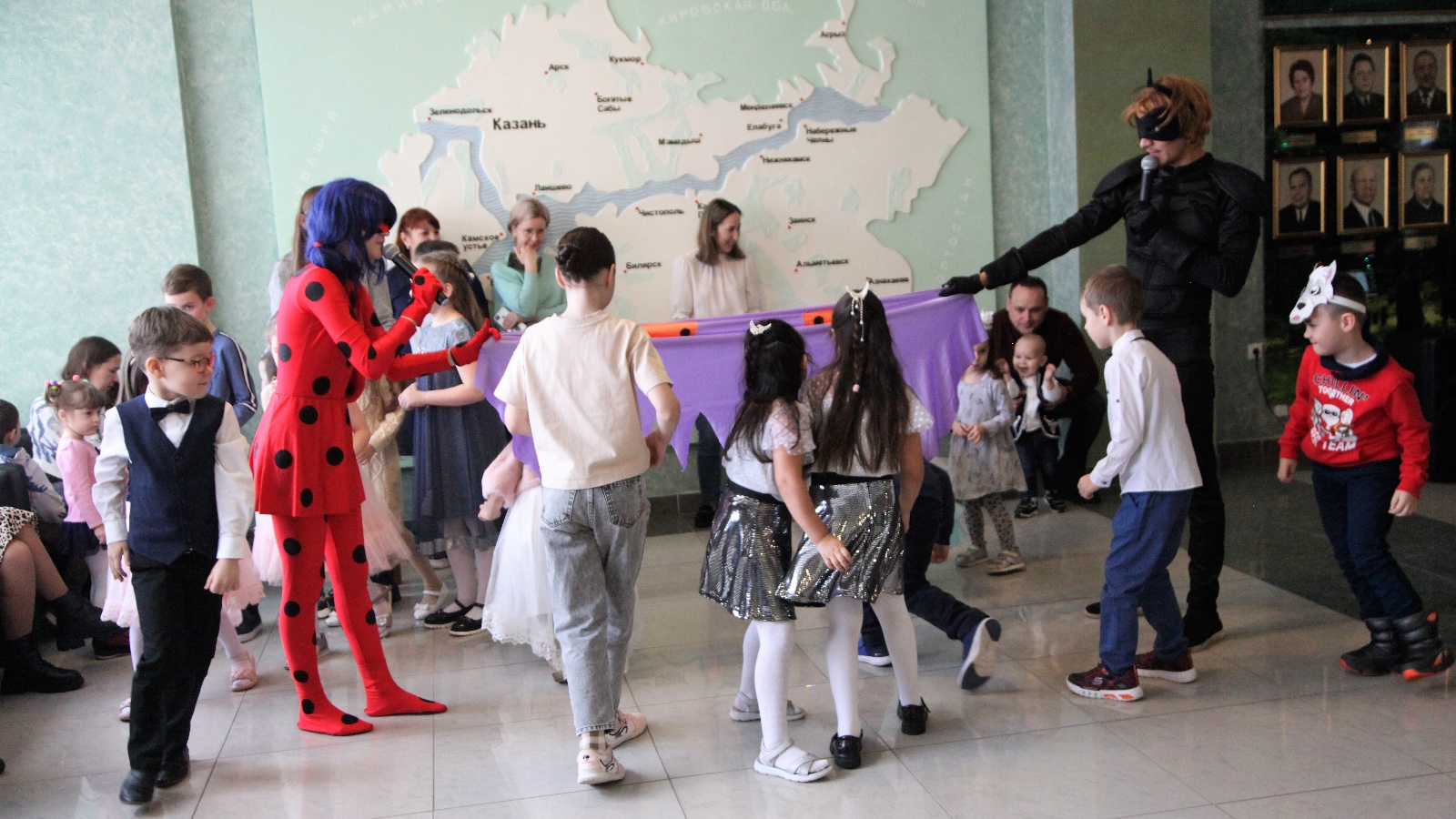 В рамках праздника были проведены различные игры и конкурсы. Сотрудники Министерства и их дети увидели сказочных персонажей – Леди Баг, Супер-Кота, Деда Мороза и Снегурочку.