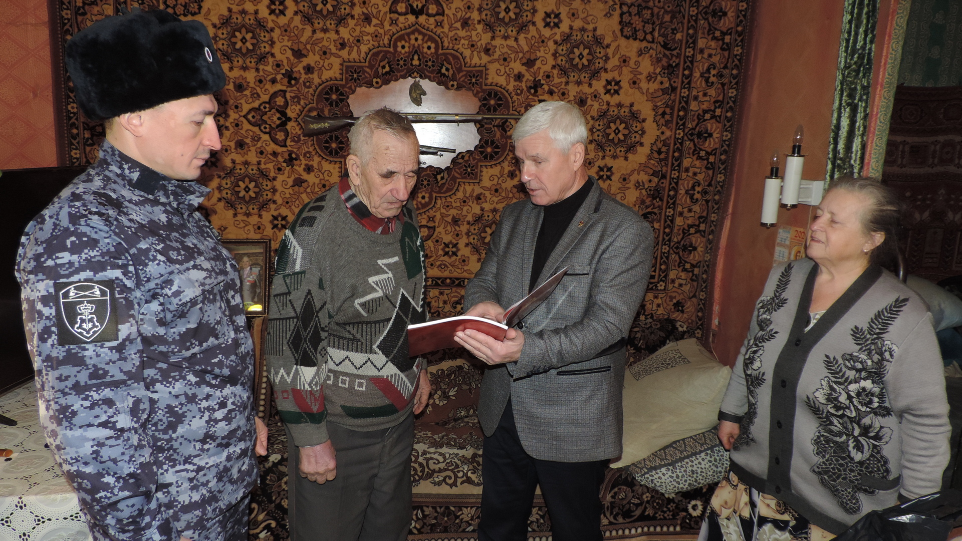 В рамках всероссийской новогодней акции «С Новым годом, ветеран!» заместитель начальника УВО Казани Росгвардии полковник Айрат Мухаметзянов и представители региональной организации ветеранов подразделений вневедомственной охраны Татарстана - полковник милиции в отставке Валерий Харитонов и подполковник милиции в отставке Абдулла Заитов - поздравили ветеранов службы с наступающим праздником и вручили им новогодние подарки. Росгвардейцы навестили на дому полковника милиции в отставке участника Великой Отечественной войны Мануила Давлетшина и старшину милиции в отставке труженика тыла Петра Филиппова.