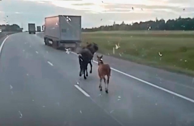 Судя по кадрам, мужчина едва держался в седле. Вслед за ними скакал жеребенок. В какой-то момент «ковбой» оступился и рухнул с жеребца прямо посреди трассы.