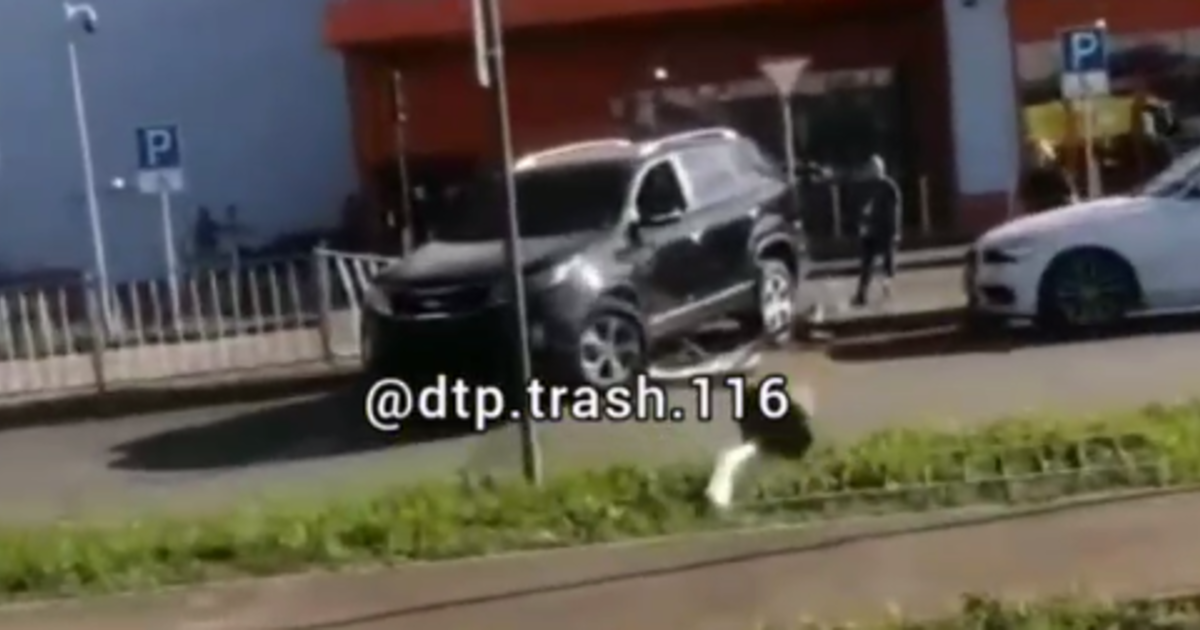 Фото: скриншот видео из соцсетей В Казани водителю автомобиля Kia Sportage потерял управление на парковке гипермаркета OBI и снес железное ограждение.