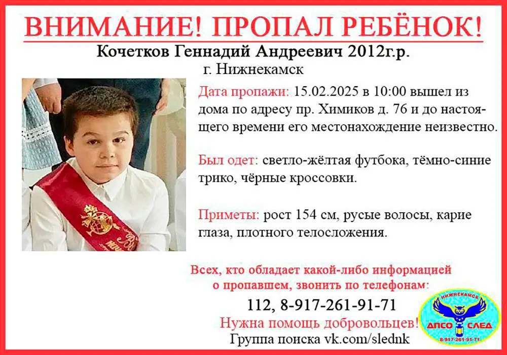 В Нижнекамске объявлен срочный сбор на поиски 12-летнего Геннадия Кочеткова.