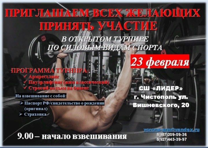 Чистопольцев приглашают принять участие в открытом турнире по силовым видам спорта. Он состоится 23 февраля на базе спортивной школе «Лидер».