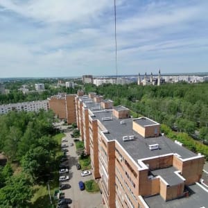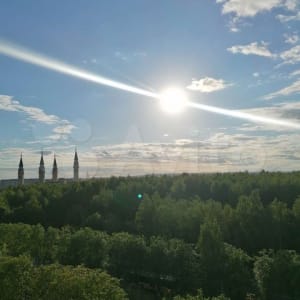 Отличный вид из окон во двор (восточная сторона) на высокие деревья и на городской парк (западная сторона).