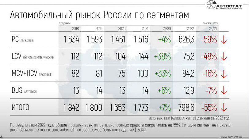 Ни один сегмент не показал ростПрошедший год был для авторынка провальным. Продажи всех транспортных средств в России сократились на 55% по сравнению с 2021 годом, причем ни один сегмент не показал рост, сообщил исполнительный директор «Автостата» Сергей Удалов на конференции, которую организовала компания.