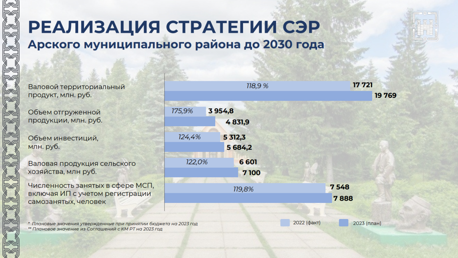 Глава Арского района Ильшат Нуриев рассказал, что основным показателем деятельности района является величина валового территориального продукта, которая по итогам 2022 года составляет 18 млрд рублей. или 124% к уровню 2021 года. В текущем году прогнозируется порядка 20 млрд рублей.