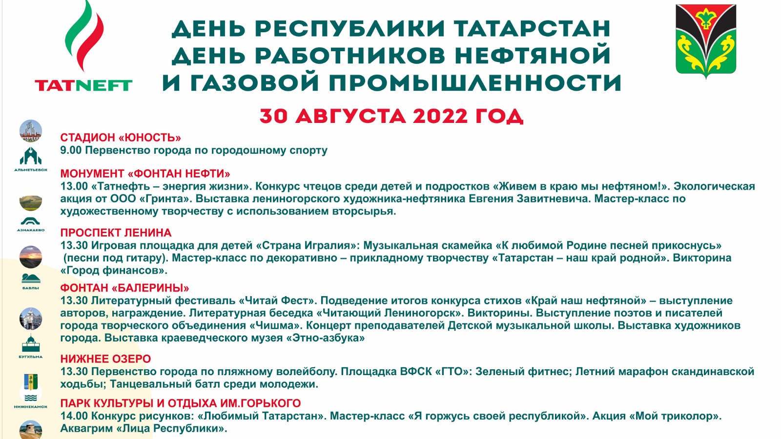Афиша праздничных мероприятий, посвященных Дню Республики Татарстан и Дню работников нефтяной и газовой промышленности, которые пройдут 30 августа 2022 года.