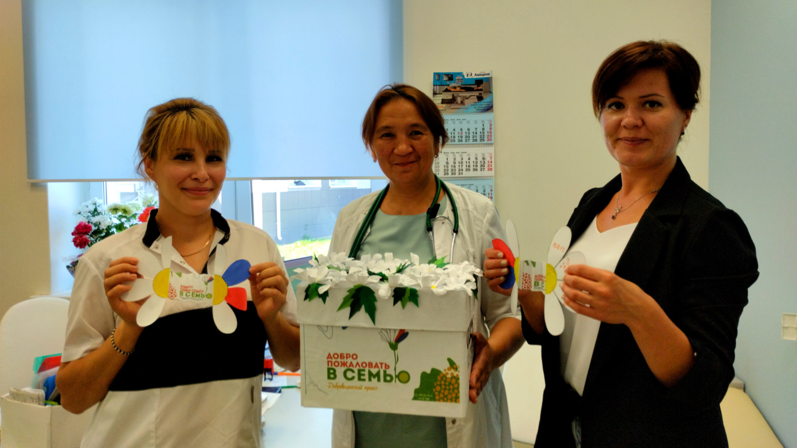 Специалисты комплексного центра доставили коробку с ромашками в детскую поликлинику. Медицинские работники торжественно вручат их семьям новорожденных.