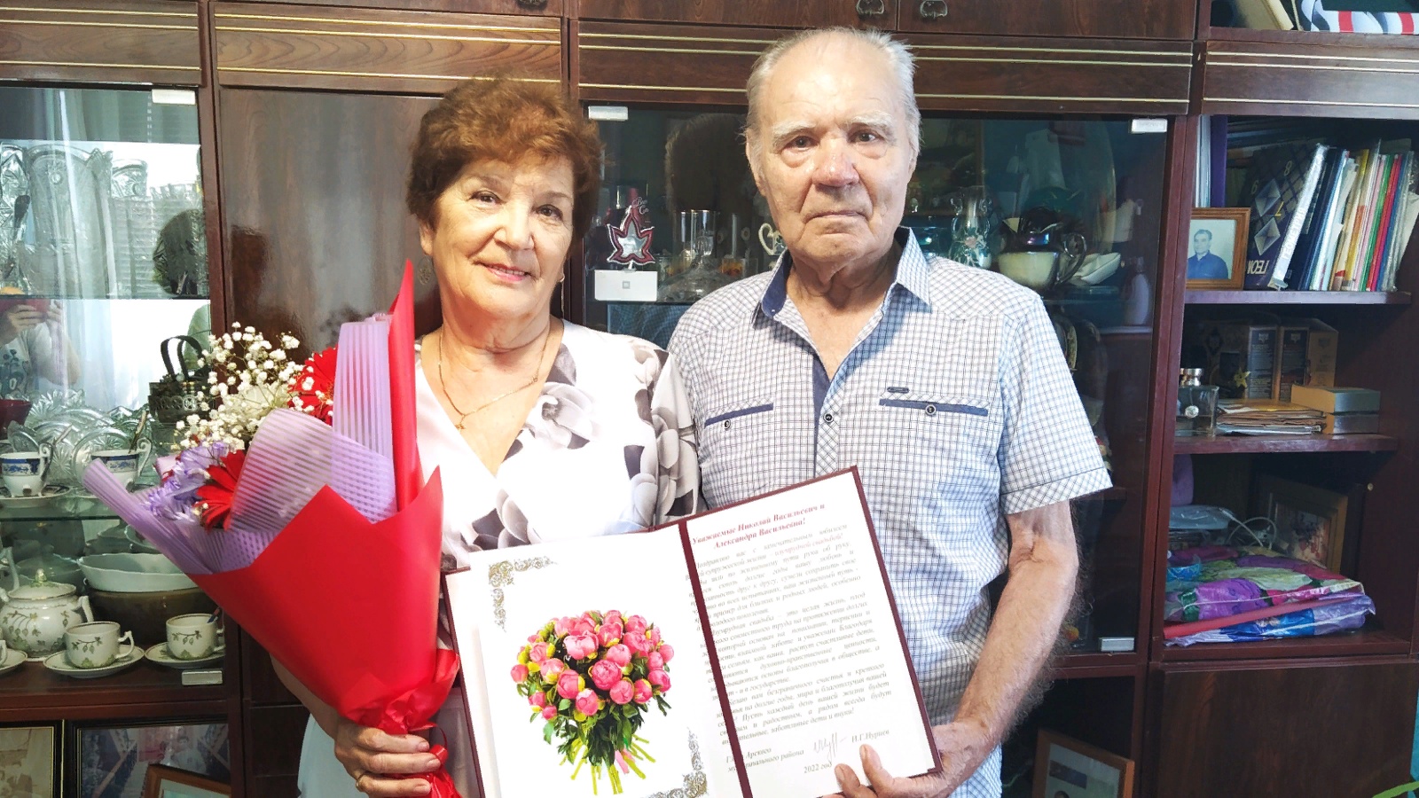 – Всю жизнь жили в этой квартире. Мы не гонялись за богатством. Сначала думала о школе, детях. Сейчас живем для себя. Мы вместе – это самое главное. Дети, внуки – наше богатство, – говорит Александра Васильевна. – Вы сказали, что я выгляжу моложе. Вот в этой комнате мы всегда были счастливы – и вдвоем, и с детьми. И сейчас ценим и уважаем друг друга, встречаем детей, общаемся, делимся радостями. И завтра ждем приезда детей. Вместе отпразднуем нашу бриллиантовую свадьбу. Я счастливая женщина. Наверное, это и есть секрет молодости.