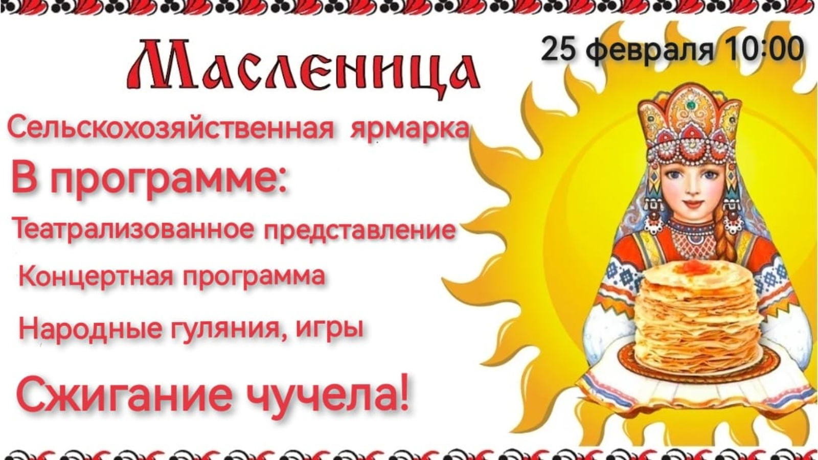 Уважаемые мензелинцы! 25 февраля на Октябрьской площади состоится сельскохозяйственная ярмарка. Начало работы ярмарки – 8:00. На ярмарке в широком ассортименте будет представлена разнообразная продукция: мясо, молочные продукты, мясо птицы, рыба, а также другие товары, пользующиеся повышенным спросом населения. Продукцию собственного производства представят сельхозтоваропроизводители, КФХ, сельские поселения, личные подсобные хозяйства, предприниматели. Также здесь пройдут масленичные гулянья. Вас ждут театрализованное представление, увлекательная концертная программа и игры, сжигание чучела. Можно будет подкрепиться вкусными блинами и горячим чаем. Начало мероприятия в 10.00.
