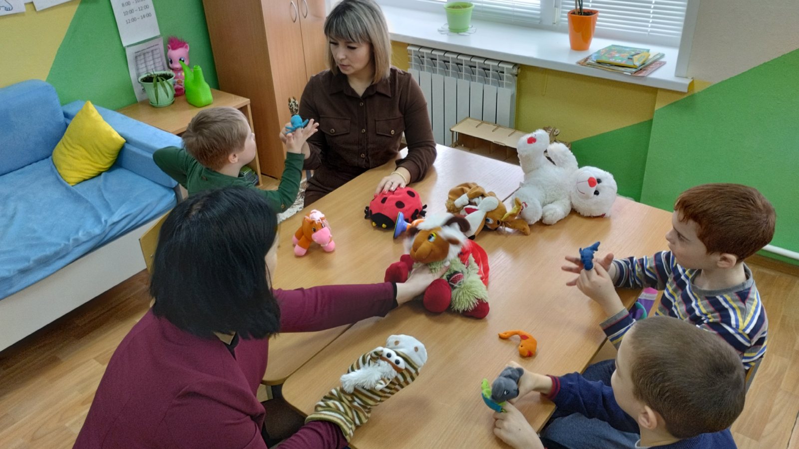 В начале занятия была продемонстрирована презентация «Сказки народов». Для развития крупной и мелкой моторики выполнили упражнение с мячиком су-джок, из пластилина ребята слепили героев из любимых сказок. Одним из наиболее понравившихся моментов стал пальчиковый театр. Также дети участвовали в театрализованной постановке сказки «Колобок».