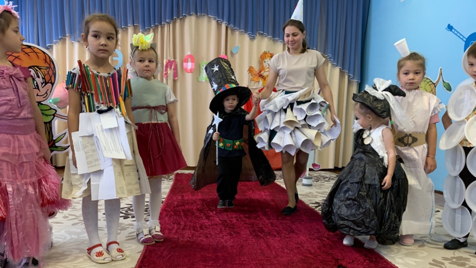 Чтобы этот процесс был увлекательным, занимательным познавательным, педагоги учреждения применяют различные формы работы. Дружная команда " Экопатруль" командир команды Фасхетдинова Р.И., выполняли сегодня третье задание Республиканского экологического онлаин-конкурса "ЭкоДети 2022". Юные модели, воспитанники детского сада, очень старались - демонстрировали одежду, а зрители громко аплодировали. Ребята представили яркие костюмы из фантиков от конфет, мусорных и полиэтиленов мешков, коробок и т.д.