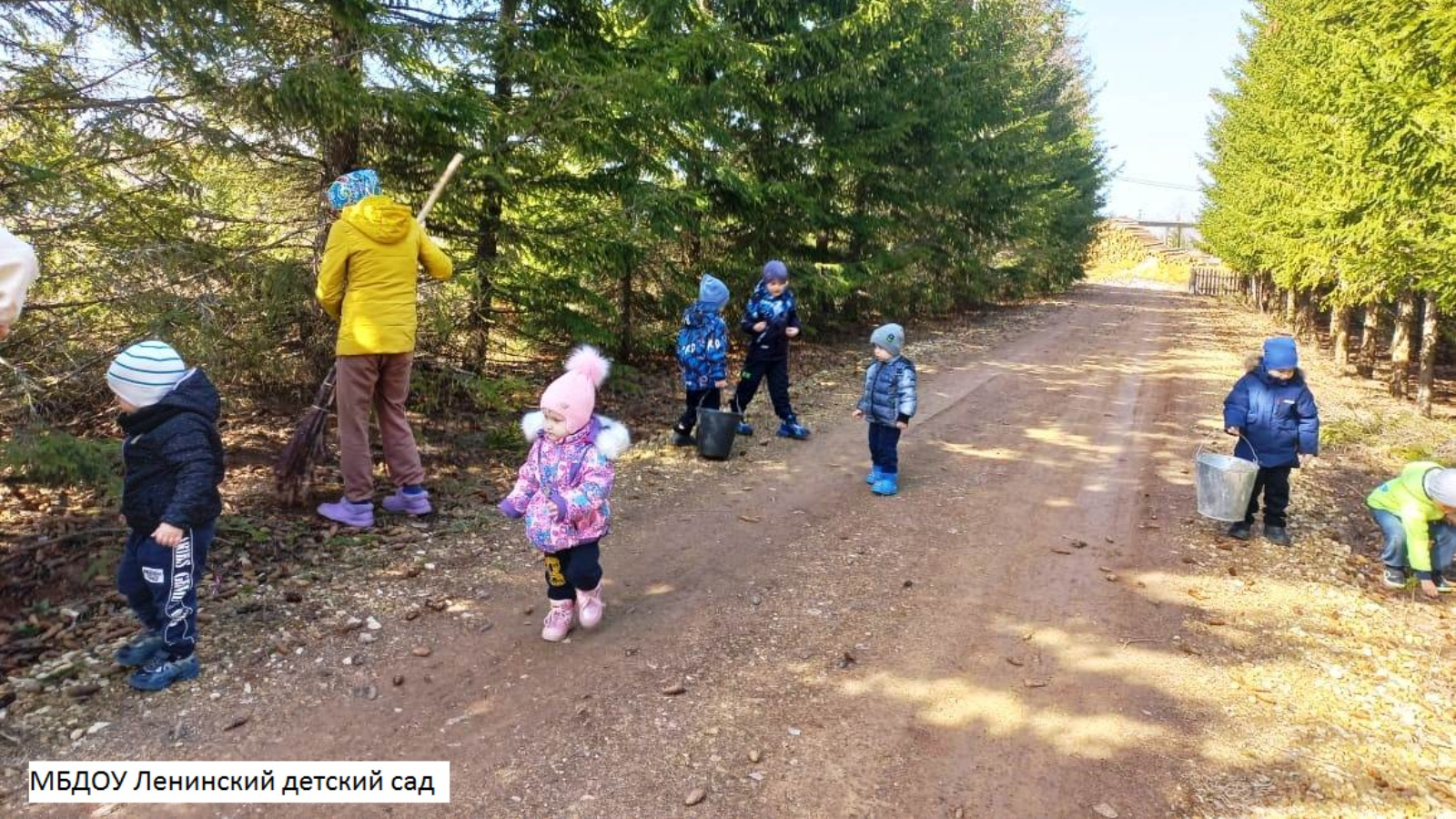 Воспитанники и сотрудники детского сада поселка Лесной вышли на уборку территории.