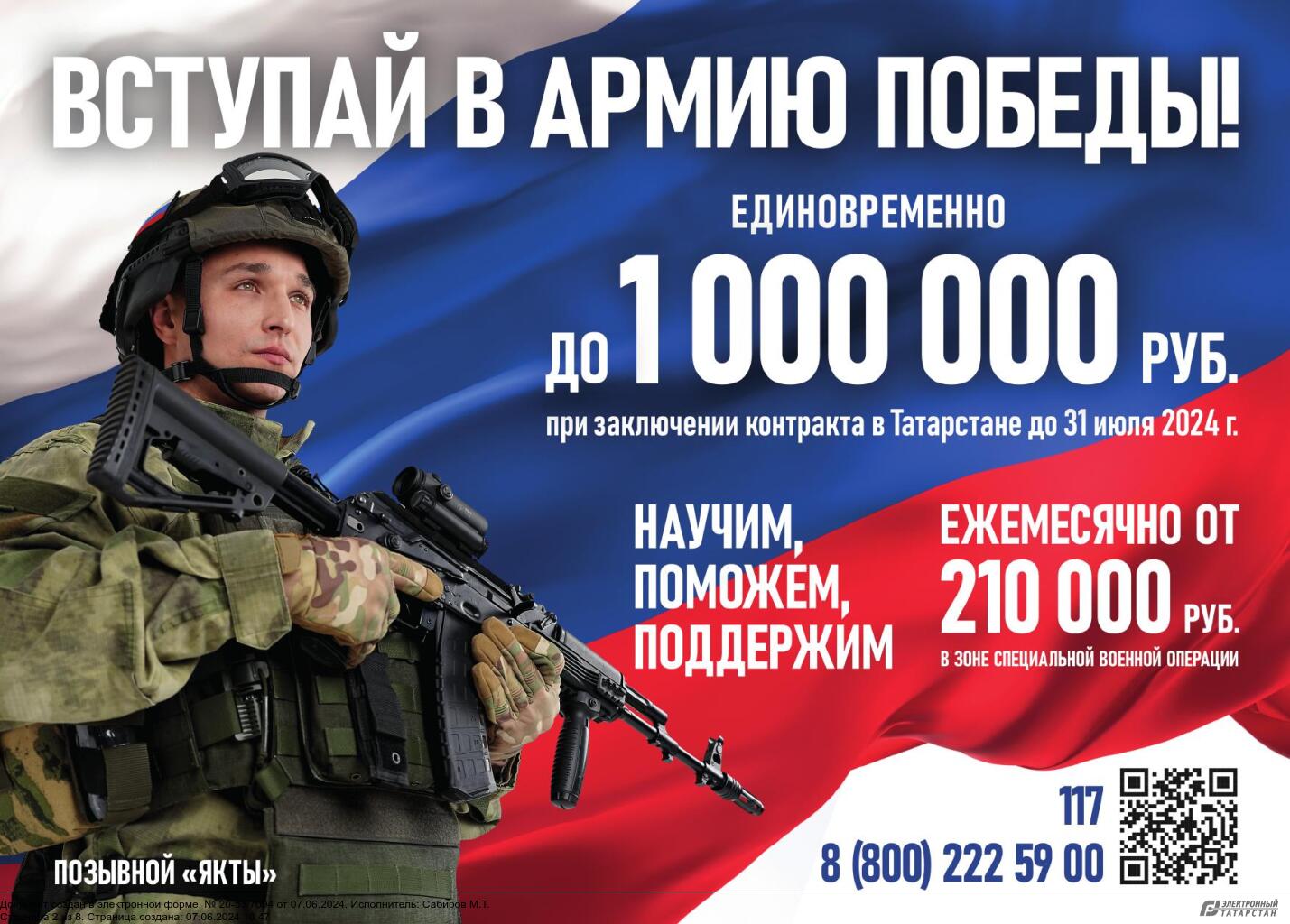 В настоящее время в Республике Татарстан единовременная выплата гражданам, заключившим контракт с Министерством обороны Российской Федерации, увеличена и составляет до 1 000 000 рублей.