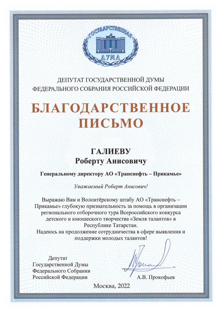 АО «Транснефть – Прикамье» отмечено благодарственным письмом депутата Государственной Думы Федерального Собрания Российской Федерации А.В. Прокофьева за помощь в организации отборочного тура Всероссийского конкурса «Земля талантов» прошедшего в Казани.