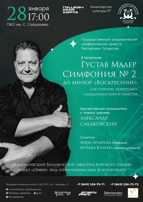 Государственный академический симфонический оркестр РТ под управлением Александра Сладковского в эту субботу в ГБКЗ им. Сайдашева впервые исполнит Вторую симфонию Малера. В декабре прошлого года ГАСО РТ уже представили премьеру Симфонии № 7 великого австрийского композитора, а на этот раз порадуют еще одним премьерным исполнением, на этот раз Симфонии № 2 «Воскресение».
