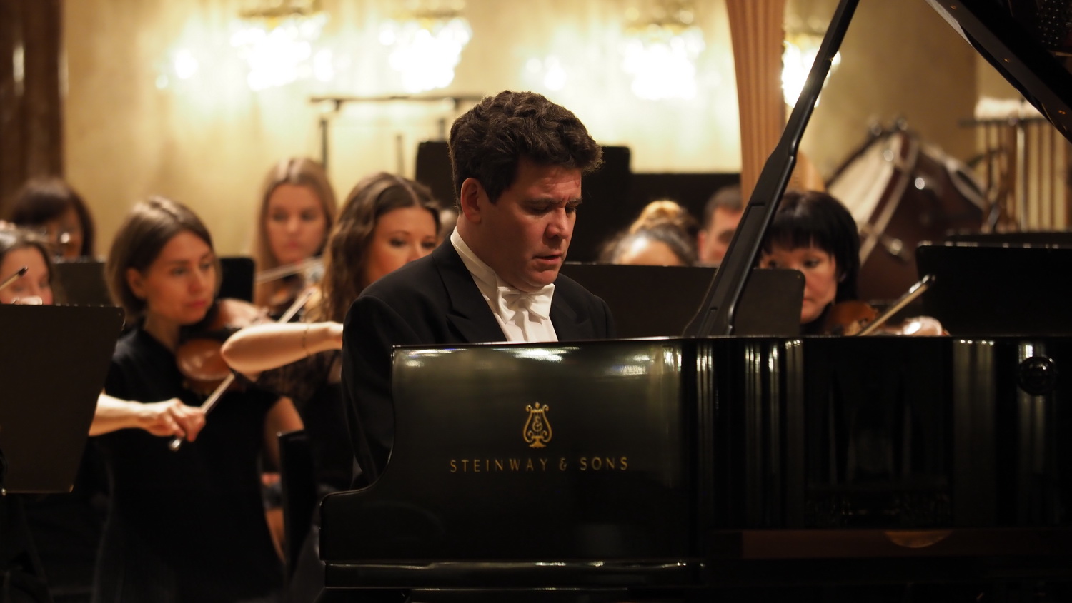 Денис Мацуев пружинистой походкой вышел, почти что выбежал к инструменту, поклонился публике и устало опустился на банкетку. Быстрый обмен взглядами с дирижёром, руки опущены на клавиатуру рояля, и печально запела валторна…