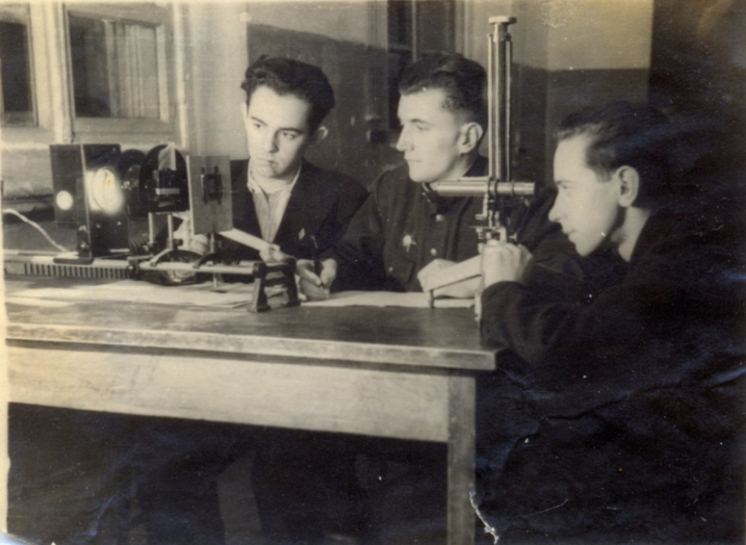 На заглавном фото: Лабораторная работа по физике. Слева направо: студенты КИИГСа Айдаров С., Ахромов Г., Лобанов Г. 1948 год