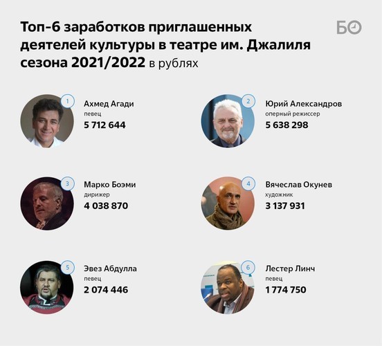 Второе место в нашем рейтинге занял другой петербуржец, оперный режиссер Юрий Александров , получивший за постановки в столице РТ спектаклей «Паяцы» и «Тоска» 5,6 млн рублей. «Бронза» у итальянского маэстро Марко Боэми , он продирижировал в завершившемся накануне сезоне театра им. Джалиля 9 спектаклей, получив в общей сложности более 4 млн, в среднем почти 450 тыс. рублей за один вечер.
