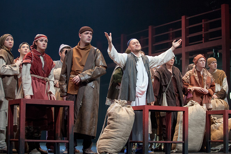 Между тем именно первая часть спектакля, которую в Казани уже видели весной, полна различных находок, симпатичных мелочей из татарского быта, юмора (вроде щебечущих Сажиды и ее пятерых сестер). Здесь же и эффектный пластический номер в сцене деревенского жыен.