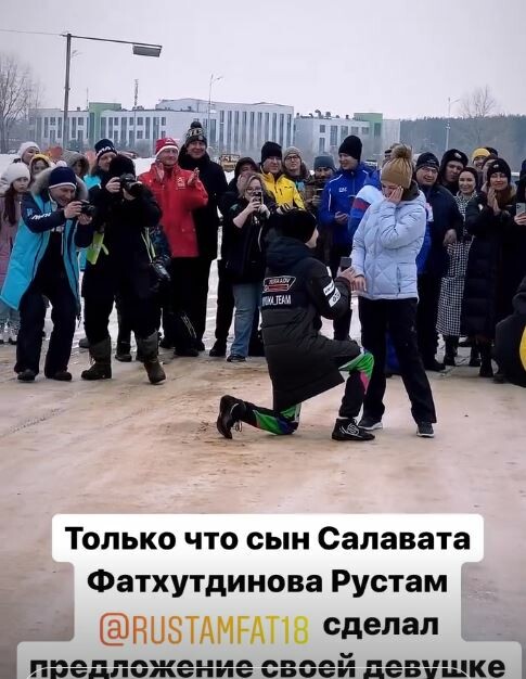 Предложение руки и сердца 19-летний молодой человек сделал в конце февраля на IV этапе чемпионата и кубка России по ледовым гонкам в Набережных Челнах на «Кубок Салавата». Предложение прозвучало при многочисленных свидетелях — гонщиках и болельщиках. Рустам опустился на колено и протянул девушке коробочку с кольцом.