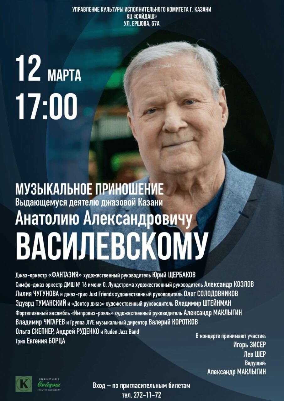 В Культурном центре «Сайдаш» 12 марта пройдет большой концерт памяти выдающегося джазмена, бенд-лидера Казани, музыканта, педагога, продолжателя традиций Олега Лундстрема , Виктора Деринга, художественного руководителя и дирижера Филармонического джаз-оркестра Татарстана Анатолия Василевского . Заслуженный деятель искусств Татарстана, профессор Анатолий Василевский прожил долгую жизнь, до 80 лет выходил на сцену в качестве дирижера и скончался минувшей осенью, в ночь на 19 ноября, на 83-м году жизни . Концерт приурочен ко дню рождения музыканта, который джазмен отмечал 11 марта.