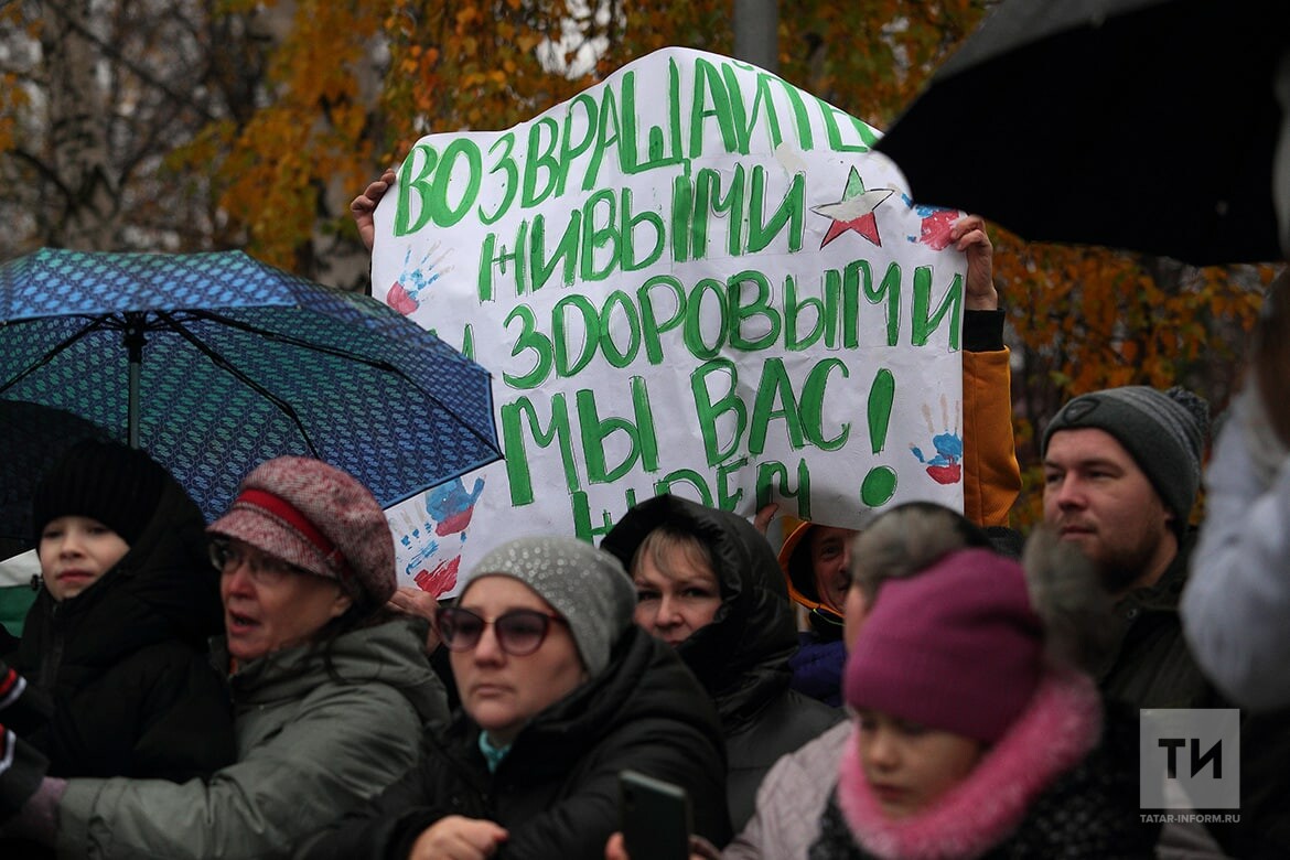 «Вы – боевые братья, прикрывайте друг другу спины и выручайте из беды»Несмотря на сильный ливень, церемония официально началась с вынесения знамен Казанского танкового училища и флагов России и Татарстана. Близкие мобилизованных стояли за ограждениями и наблюдали за своими мужчинами. Они ждали той минуты, когда окончится официальная часть и они смогут подойти к своим мужьям и сыновьям.