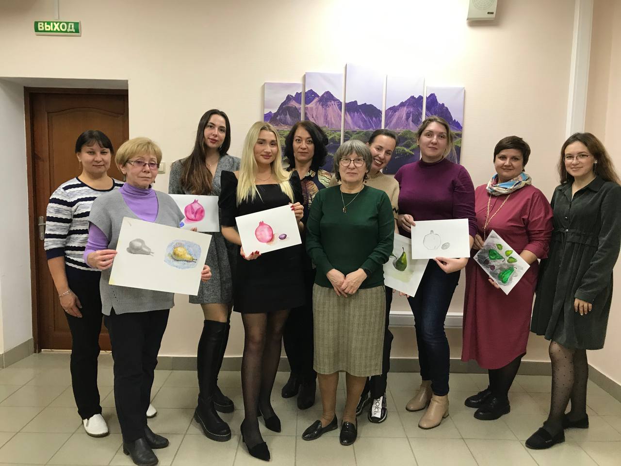 В рамках мастер-класса Елена Богоявленская поделилась с коллегами техниками рисования. Каждый участник мог забрать с собой свой натюрморт.