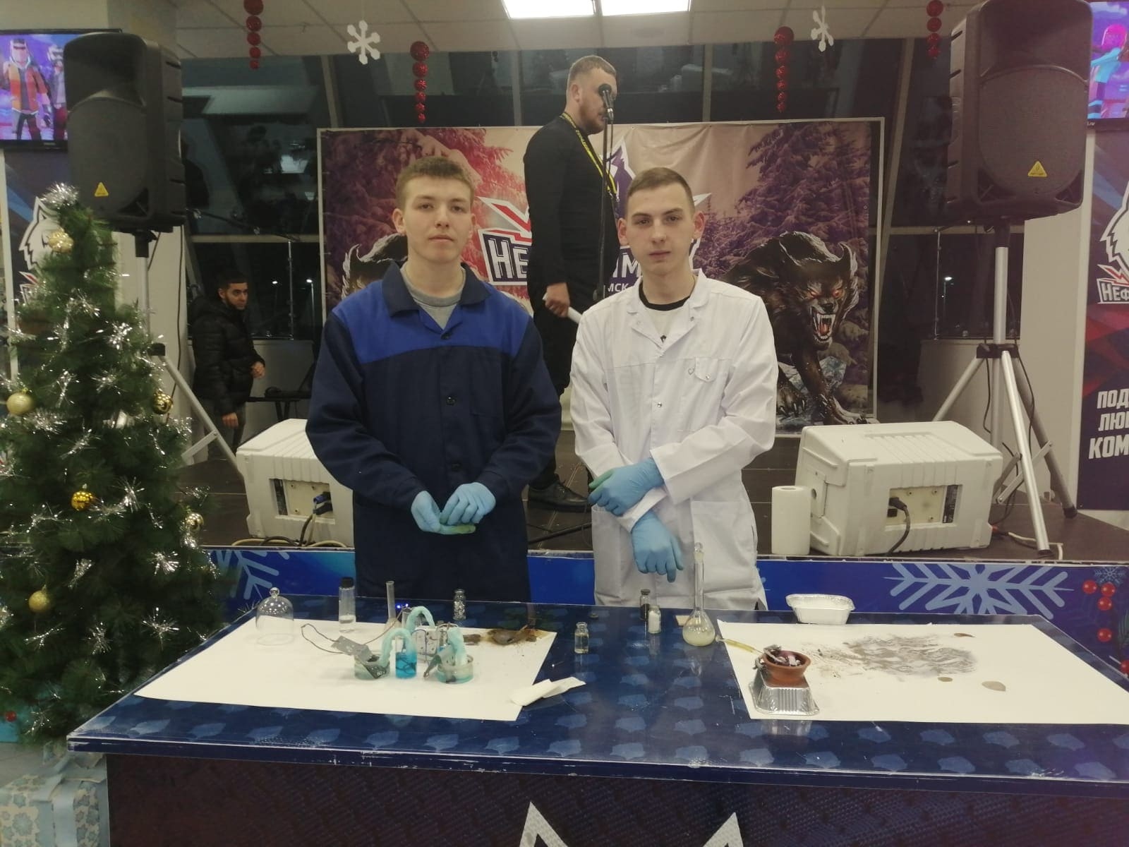 21 декабря в Ледовом дворце «Нефтехимик» на матче ХК «Нефтехимик»: КуньЛунь Ред Стар во время перерыва по окончании первого периода студенты Нижнекамского химико-технологического института Сайдашев Камиль и Шумилов Вадим под чутким руководством заместителя директора по ВР Габдушевой Эльвиры и старшего преподавателя кафедры НХС Валеевой Чулпан провели увлекательное химическое шоу для маленьких болельщиков.