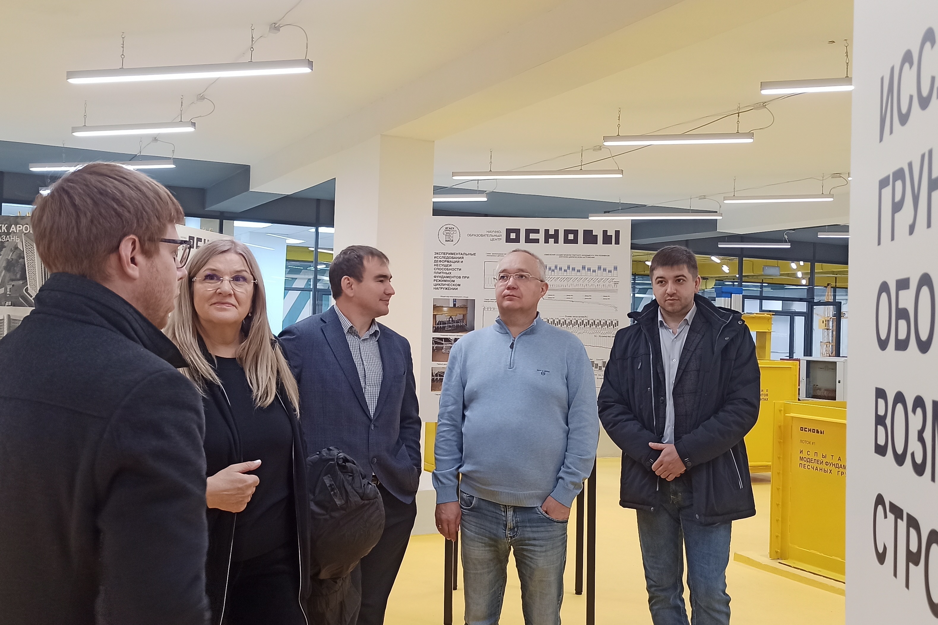 Директор Института строительства С.В. Степанов, заведующий кафедрой технологий строительного производства (ТСП) Р.А. Ибрагимов, доцент А.Р. Мавлюбердинов, аспирант кафедры оснований, фундаментов, динамики сооружений и инженерной геологии Н. Айсин ознакомили гостей с научно-образовательной площадкой КГАСУ «Основы», с её центрами «Геотехника» и «Строительство».