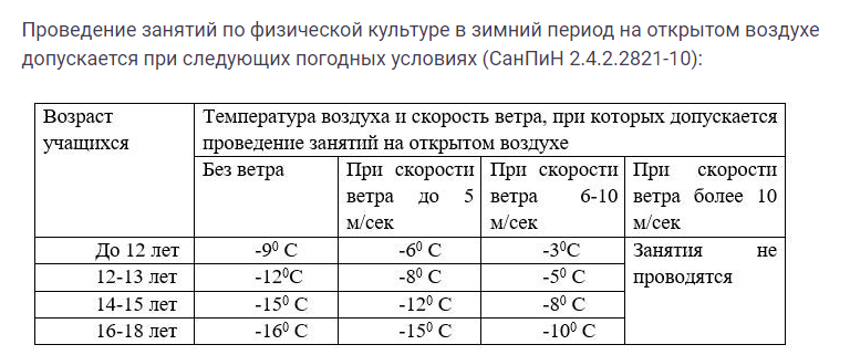 Занятия по физкультуре на открытом воздухе допускаются для учеников младших классов лишь при температуре воздуха не ниже трех градусов мороза и скорости ветра не более 6-10 метров в секунду, для старшеклассников – не ниже минус 10 градусов и ветре не сильнее 6-10 метров в секунду.
