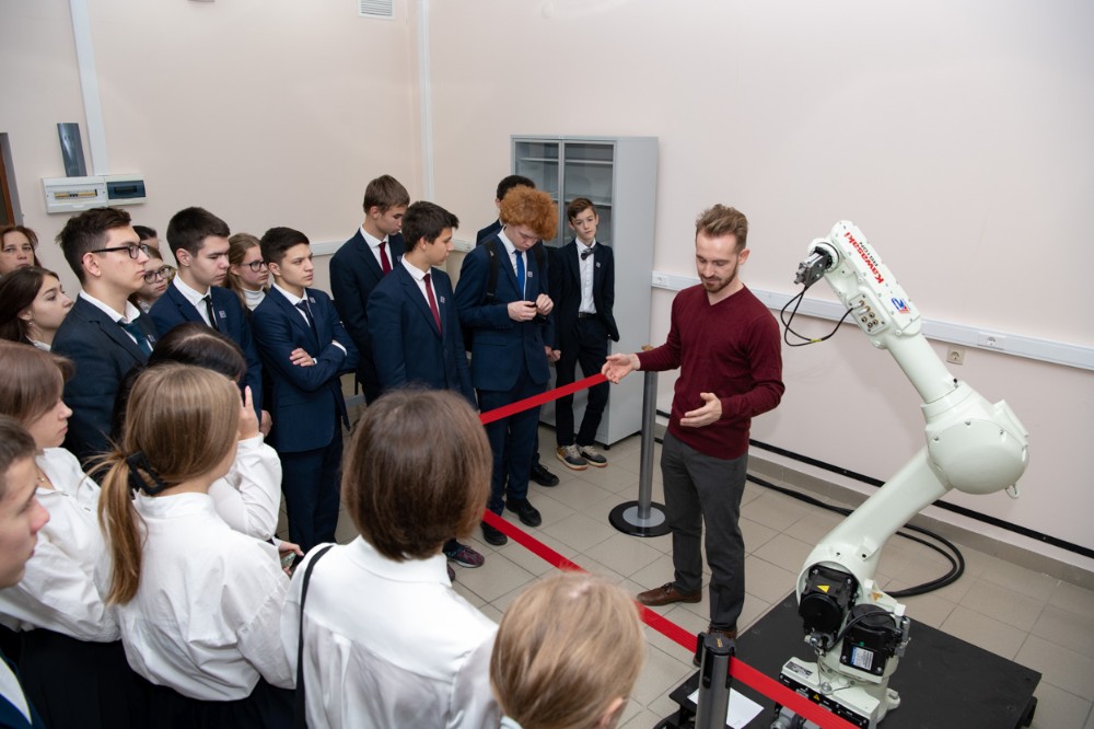 На «Лазерных технологиях» школьников встретил инженер кафедры Александр Терентьев. Со свойственным тактом педагога, Александр поинтересовался, какие разделы физики ребята изучили в школе и что они знают о лазерах. Он рассказал о физической основе работы лазера, демонстрируя всё на опытных образцах и лазерных установках. К примеру, школьников заинтересовала популярное сейчас направление – 3D-печать. Александр Терентьев показал ребятам, какие технологии используют в этом направлении и в чем разница между 3D печатью методом LMD – прямого лазерного осаждения и методом послойного лазерного сплавления SLM (Selective Laser Melting). В ходе экскурсии школьники смогли посмотреть: как изучают структуру напечатанных материалов на наличие дефектов и определения микроструктуры в лаборатории оптических исследований, посмотреть на промышленные манипуляторы, проверить работу гелий-неонового лазера на оптических стеклах в лаборатории физики лазеров, посмотреть приборы и установки для исследования порошковых материалов.