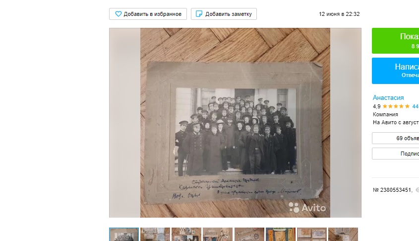 В наборе ретро-предметов московский продавец предлагает на сайте бесплатных объявлений и фотографию студенческого драматического кружка Казанского университета.