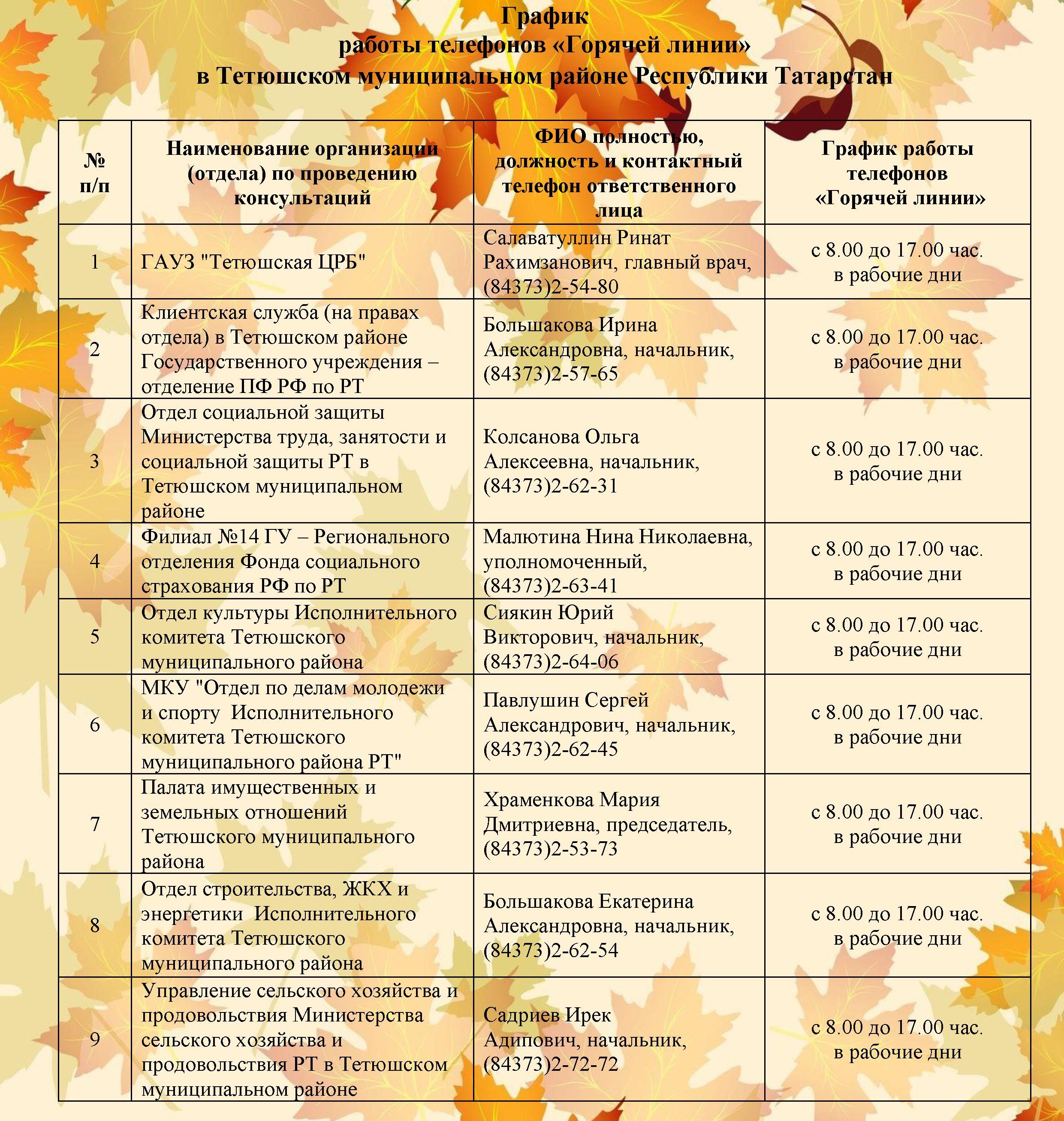 Информация предоставлена администрацией Тетюшского МР. График работы телефонов «Горячей линии» в Тетюшском муниципальном районе Республики Татарстан (Тетюши, 29 сентября, "Тетюшские зори").
