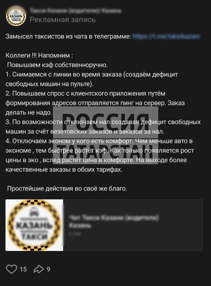 В Казани водители такси завели telegram-канал для манипуляций с коэффициентами в сервисах. Так они рассчитывают увеличить стоимость поездок. Причем свои схемы якобы обхода системы они не только не скрывают, но и закупают рекламу в социальных сетях.