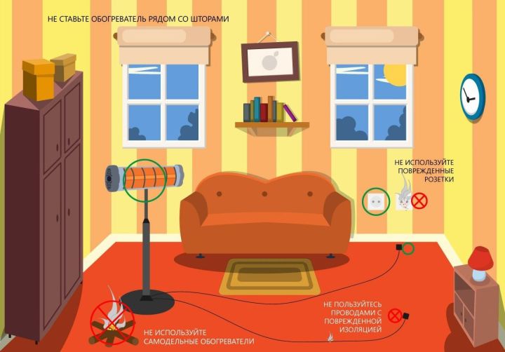 Обогреватель нужно устанавливать на огнестойкой подставке. Он должен быть исправным, от известного производителя, желательно с системой аварийного выключения (на случай его перегрева или падения).