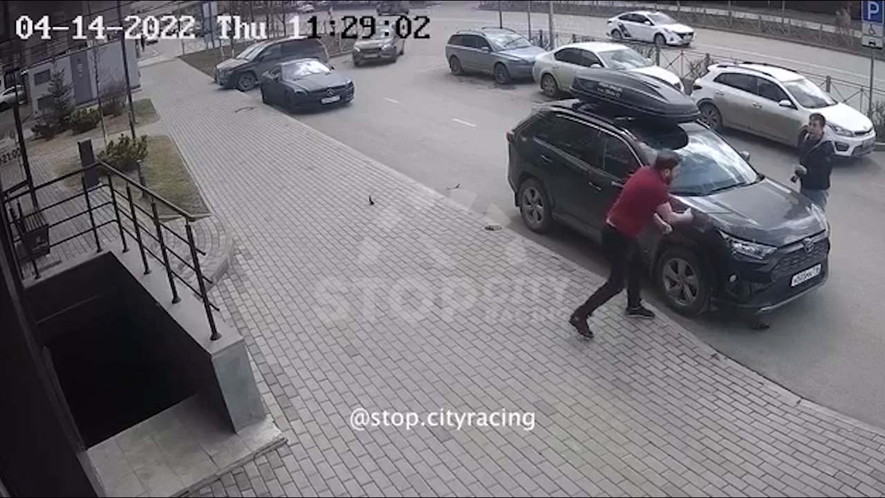 В Казани мужчина с мачете разбил иномарку. Кадры с камеры видеонаблюдения попали в социальные сети.