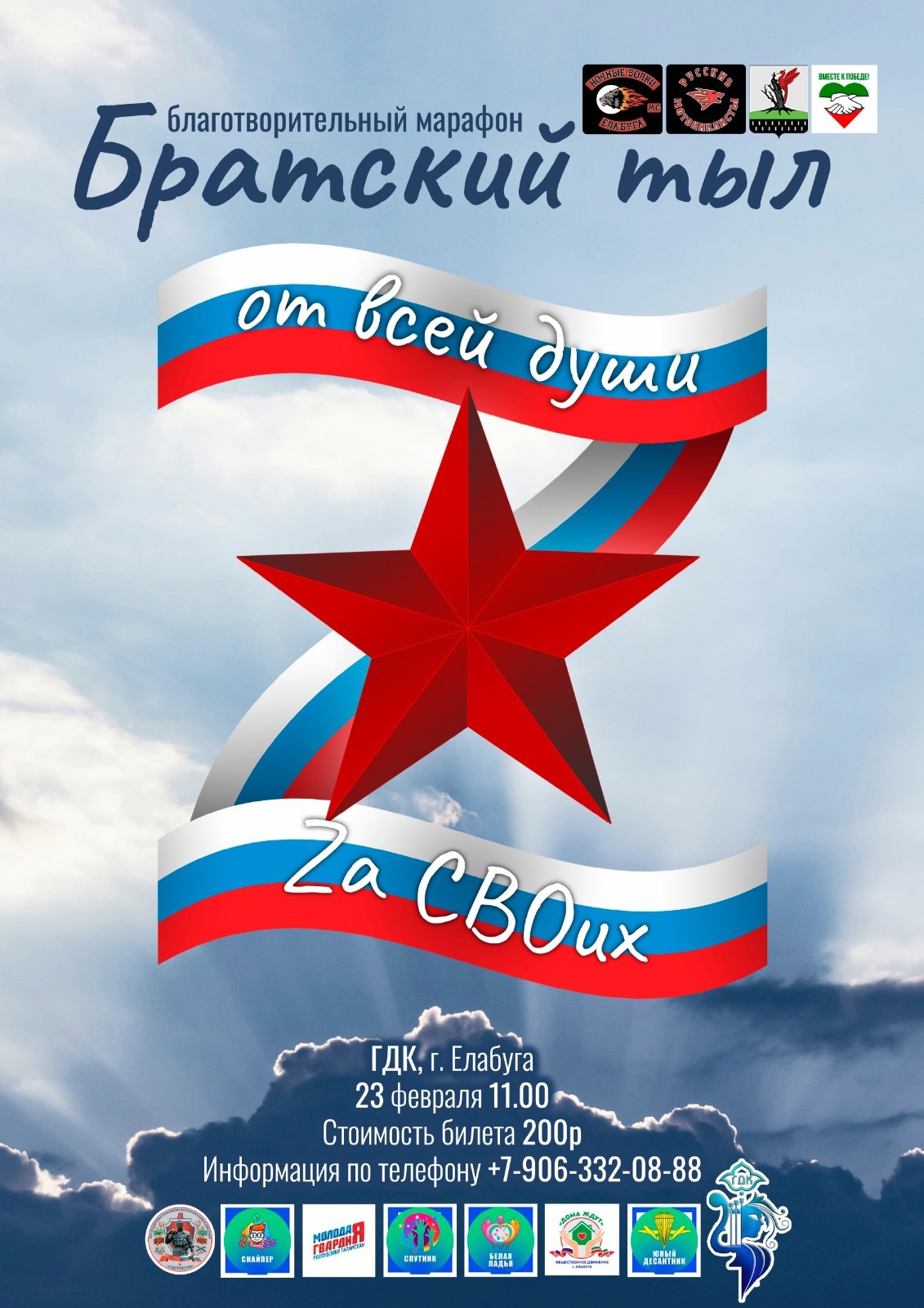 23 февраля в городском Дворце культуры состоится благотворительный марафон - "Братский тыл. Zа своих". Приглашаем елабужан и гостей города принять самое активное участие в мероприятии и поддержать наших военнослужащих.
