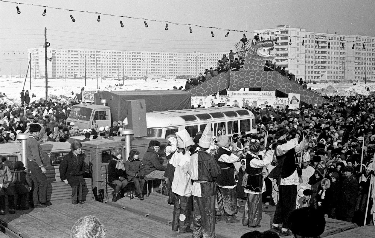В советское время праздник Масленицы называли проводы русской зимы, в новейшей истории нашего города его отмечали на пустыре перед 27 комплексом нового города. Эту огромную площадь заполоняли люди, вместо сцены использовали несколько "КАМАЗов". На фото, сделанном в марте 1976 года, понятно, что это самые грузовики, сошедшие с конвейера компании, ведь первый "КАМАЗ" был выпущен 16 февраля 1976 года.