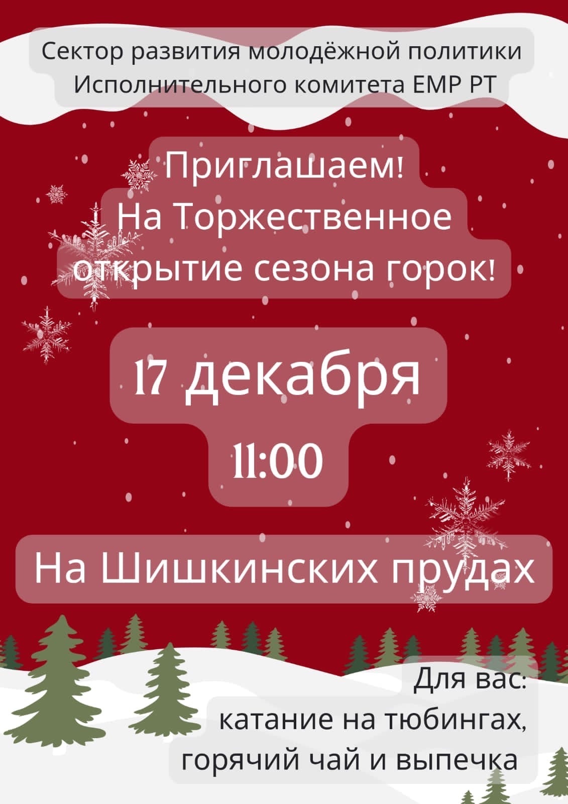 Уважаемые елабужане! 17 декабря в 11.00 приглашаем вас на Шишкинские пруды. Здесь состоится открытие сезона горок. В программе праздника ожидается катание на тюбингах и горячий чай с выпечкой. Организатор мероприятия - Сектор молодёжной политики исполкома Елабужского муниципального района. Ждём всех с хорошим настроением!