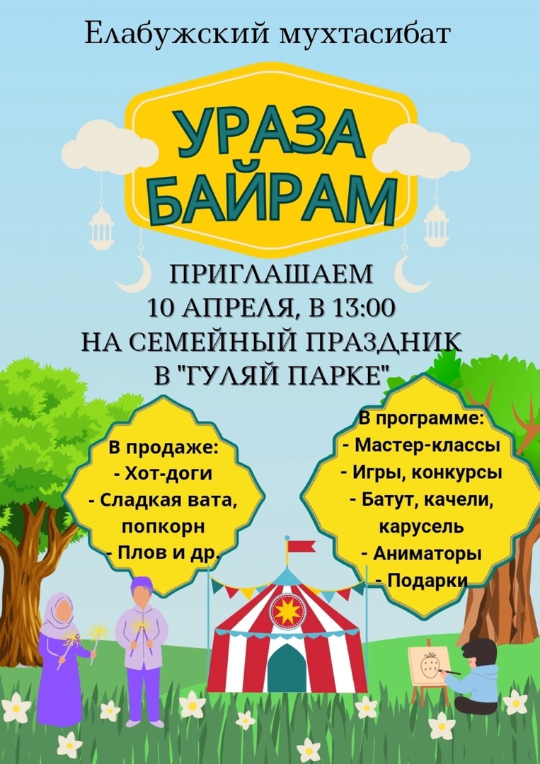 Елабужский мухтасибат 10 апреля в 13.00 приглашает на семейный праздник Ураза байрам. Мероприятие состоится в Гуляй парке. Вас ждут мастер-классы, игры, конкурсы, батут, качели, карусель, аниматоры и подарки. Гостей праздника порадуют сладкая вата, попкорн хот-дог и плов. Отметим, что в мечетях Елабуги праздничная проповедь пройдёт в 7.00, праздничный намаз состоится в 7.30