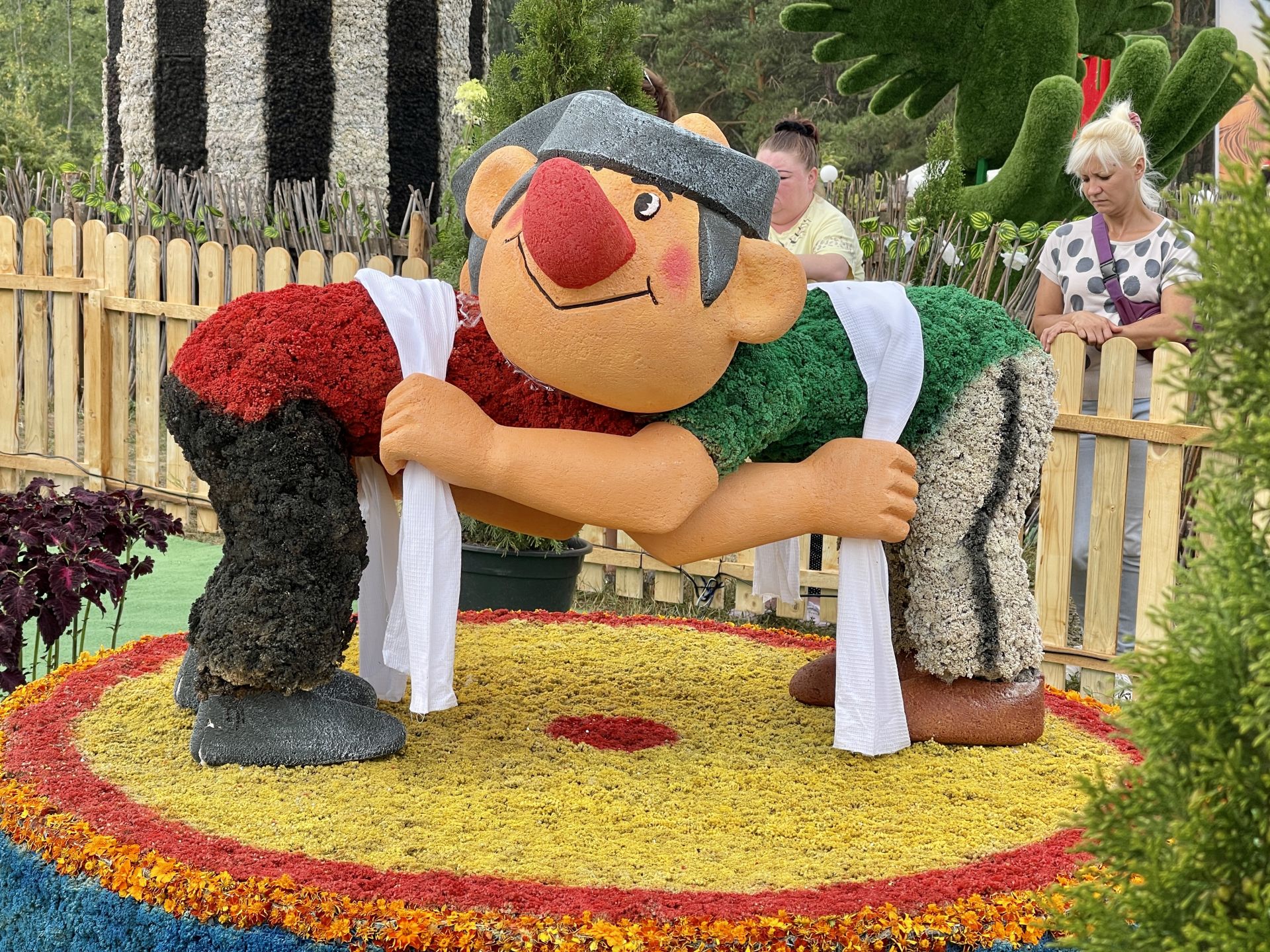 Управляющая компания «Жилкомсервис» заявила, что Набережные Челны – город чемпионов, и водрузила в центре своей площадки цветочную копию скульптуры Ильдара Ханова «Регбисты», оригинал которой, как известно, украшает вход на стадион «Строитель». Около него «присоседились» персонажи известного советского мультфильма про хоккеистов и боксёров. И, пожалуй, это одна из немногих площадок, где в этом году можно увидеть объёмных мультяшных героев.