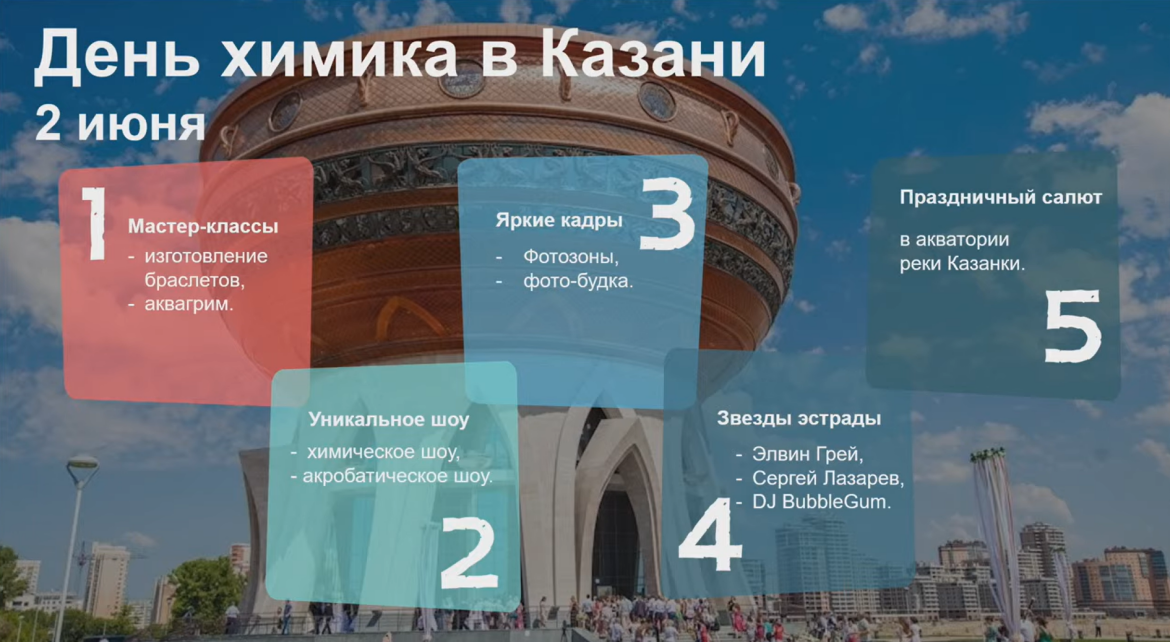 «На территории Центра семьи «Казан» праздник начнется в 18.00. В программе – химическое и акробатическое шоу, а также выступление популярных исполнителей», – сказал Абзалов.