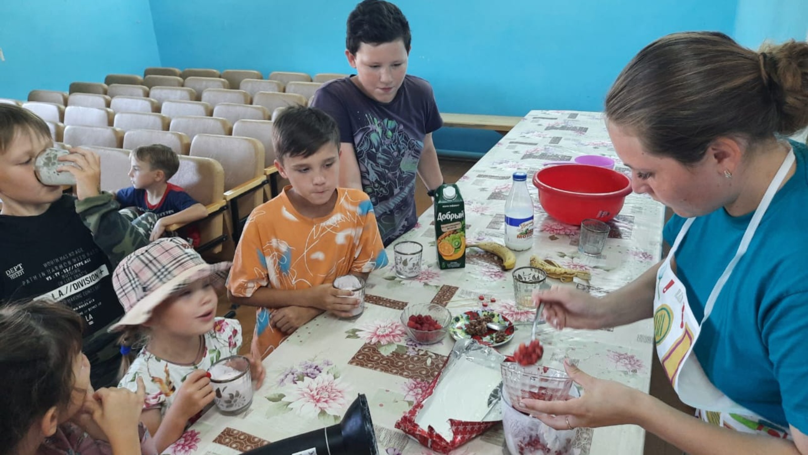 В такие жаркие дни хочется сидеть в тени или у водоёма, но сотрудники Монашевского сдк нашли другой выход- мастер-класс по приготовлению молочного коктейля.