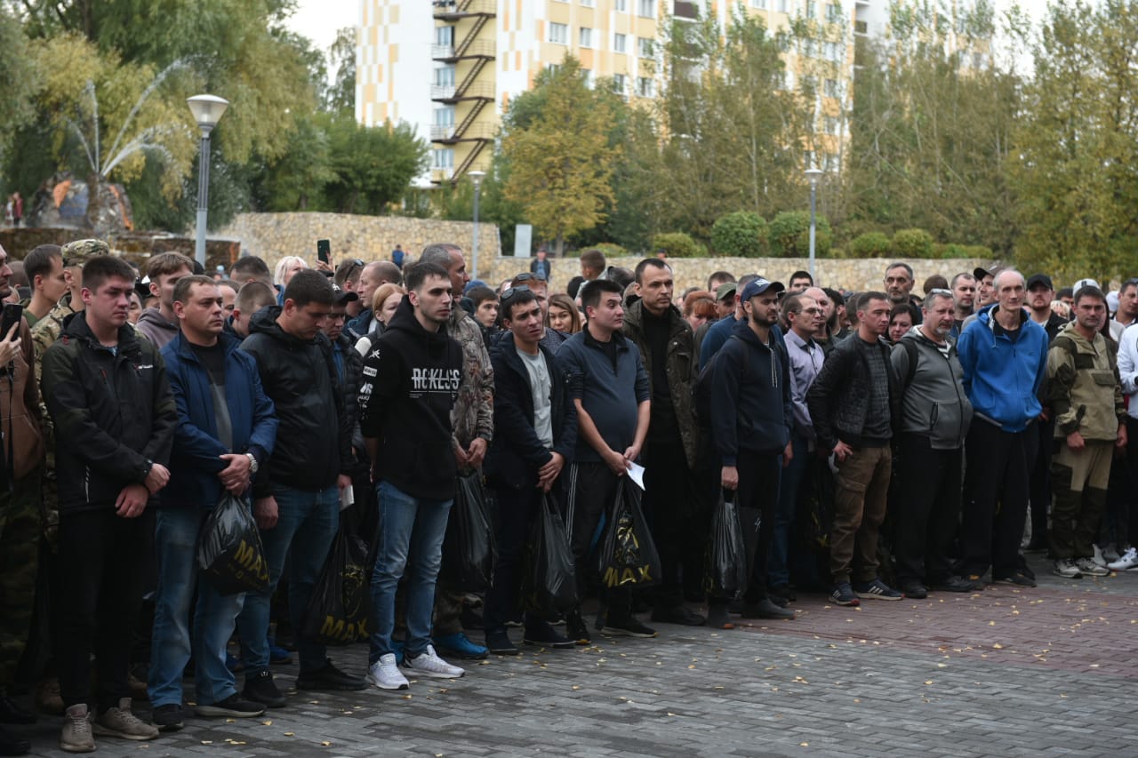 Сегодня прошло мероприятие на котором Наиль Магдеев проводил мобилизованных мужчин нашего города на выполнение специальной военной операции.