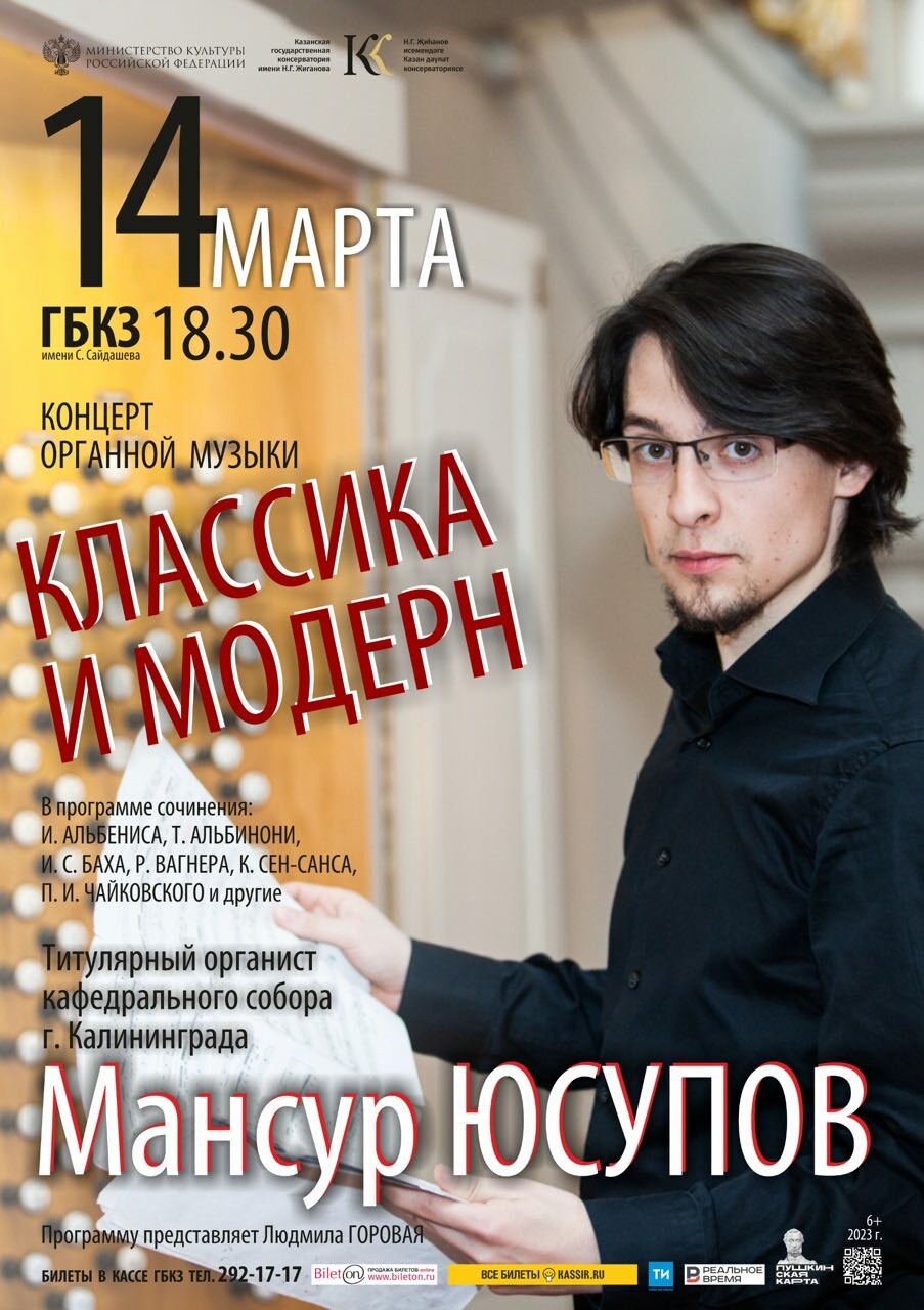 14 марта в ГБКЗ имени Салиха Сайдашева состоится концерт «Классика и модерн» органиста Кафедрального собора Калининграда Мансура Юсупова. Начало концерта — 18:30.