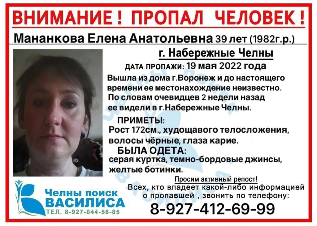 19 мая 2022 года в Воронеже пропала 39-летняя Елена Мананкова. Она вышла из дома и перестала выходить на связь. Две недели назад женщину видели в Набережных Челнах, поэтому просят горожан помочь с ее поисками.