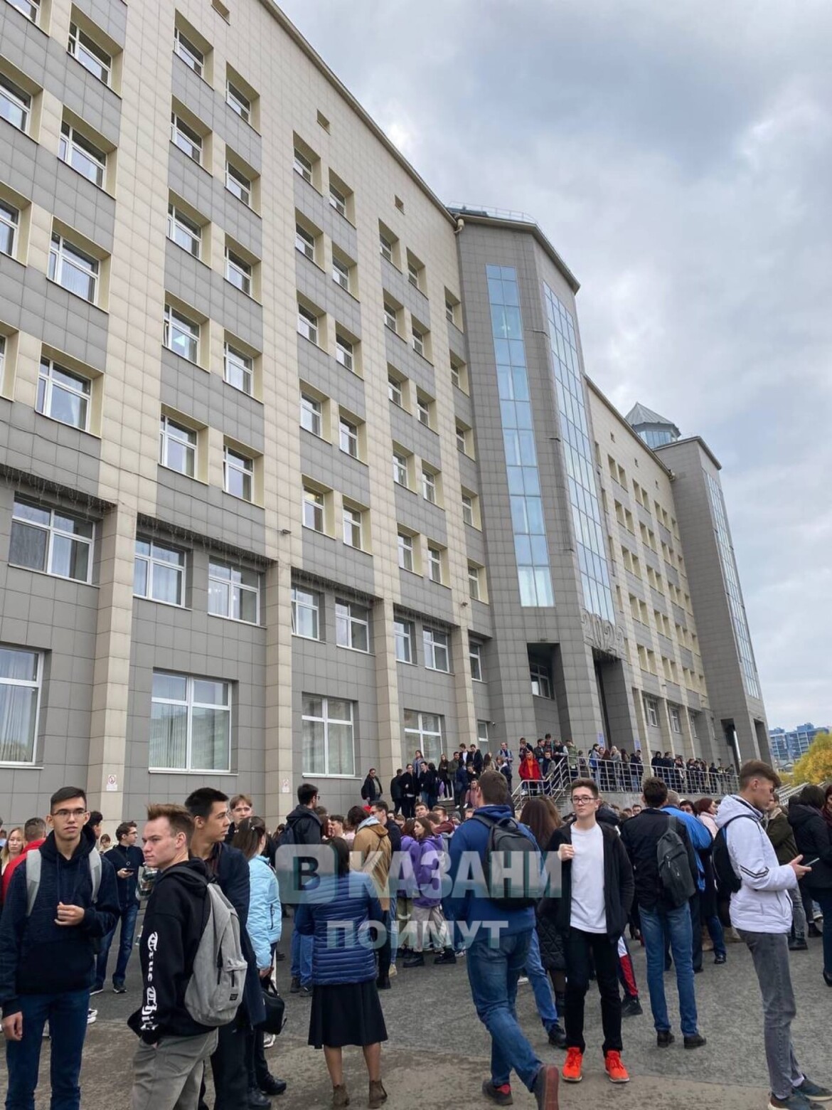 На фотографиях видно, что учащиеся, покинувшие здание вуза, стоят на улице у корпусов.