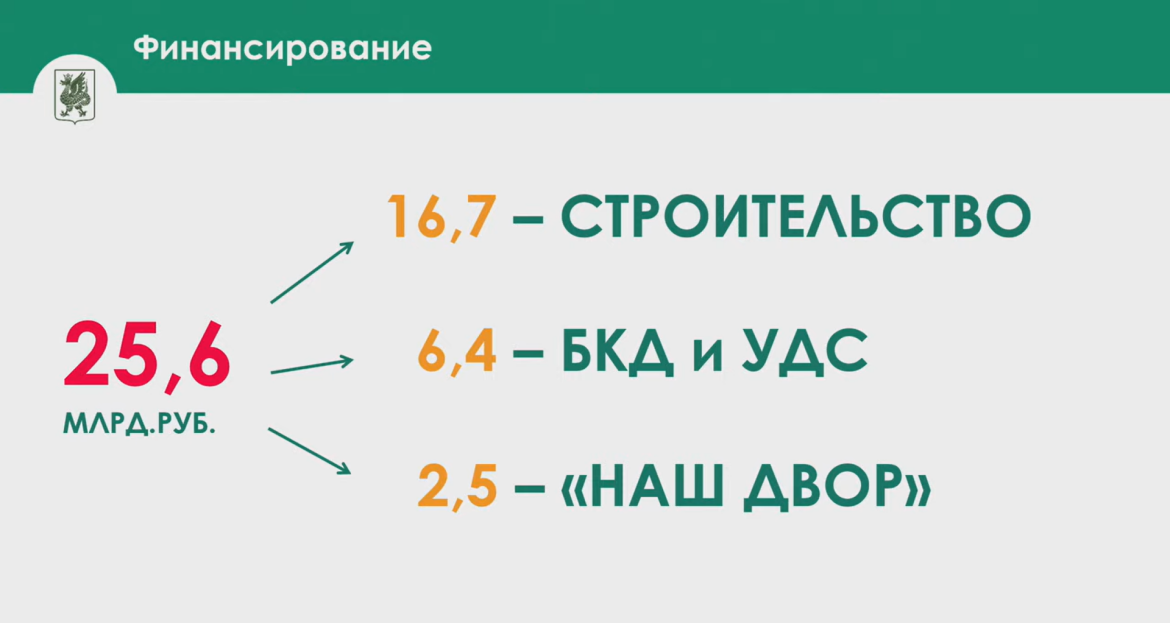 «На развитие и ремонт дорожной сети, а также благоустройство дворовых территорий была выделена беспрецедентная сумма 25,6 млрд рублей. Из них 16,7 – на строительство и реконструкцию дорожных объектов, 6,4 – на ремонт объектов уличной дорожной сети, и 2,5 млрд рублей на реализацию программы «Наш двор»», - сказал он.